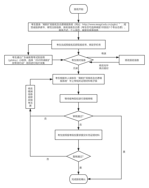 考生登录广东省高职扩招报名及志愿填报系统(https://pg.eeagd.edu.cn/ks),根据系统指引阅签诚信承诺书,填写注册信息、报名信息及志愿信息、联系方式、个人简历、家庭关系等信息,获取报名号、绑定手机号,通过微信小程序采集相片并经核对信息无误后根据实际按照要求上传相关证明材料电子版。高职扩招报名及志愿填报工作全部在网上进行,时间为9月22日14:00至9月27日14:00,逾期不再办理相关手续,考生不得再修改已填报个人信息及院校专业志愿。相片上传不成功的考生,请与所报考的院校联系。